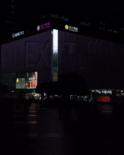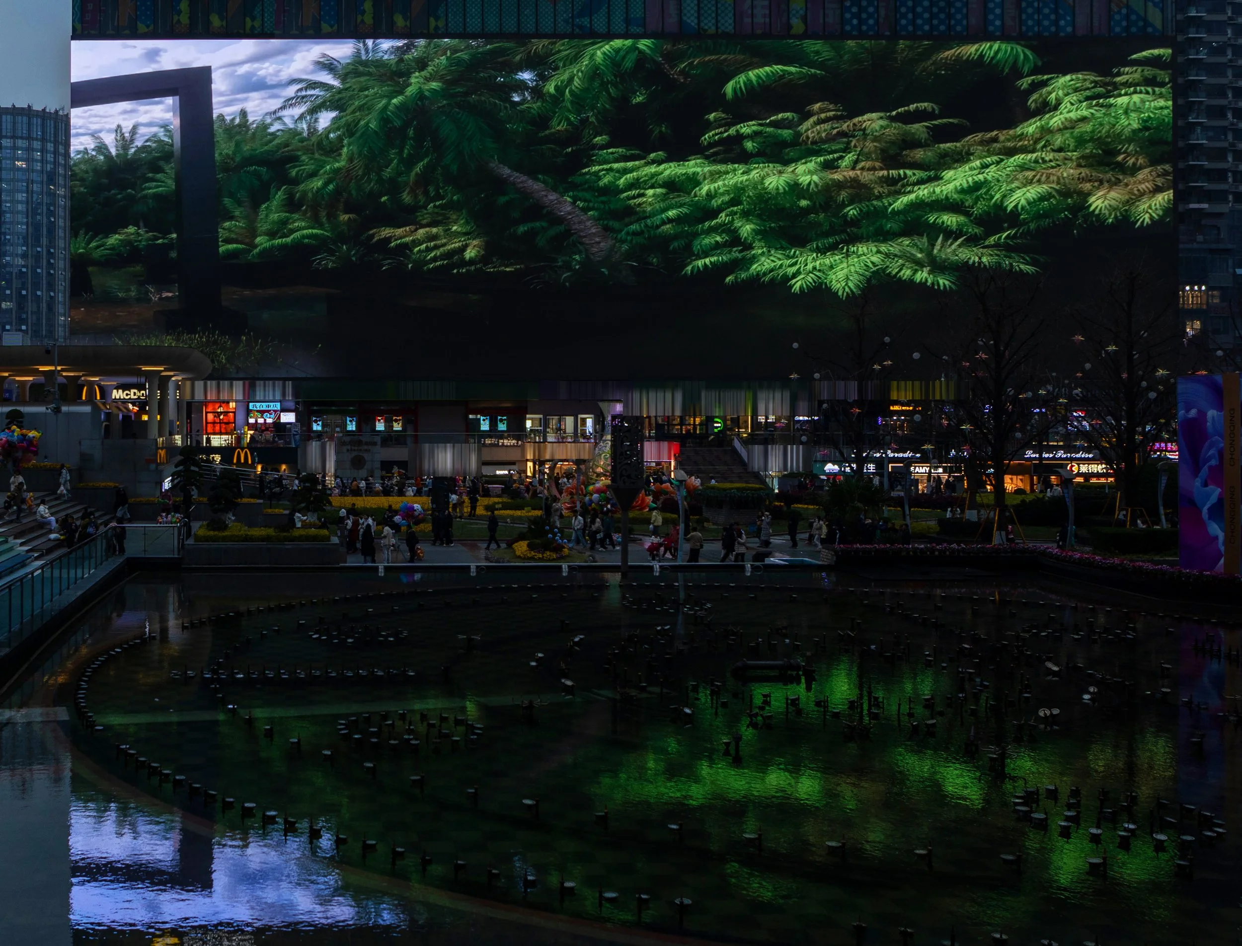 Unfolding across “3788 Light of Asia,” a monumental 3,788 m² LED screen in Chongqing, the scene stages a surreal garden feast poised between architecture and jungle.