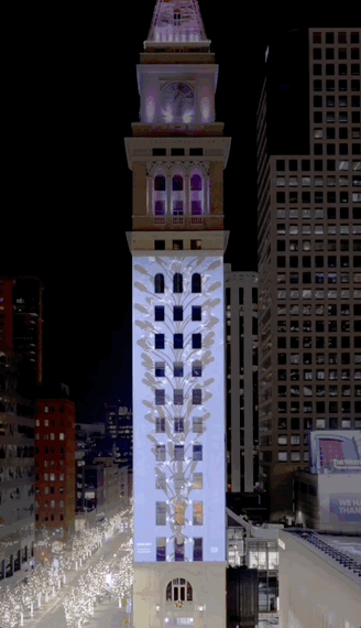 Night Lights Denver is a collection of light and projection-based art installations throughout Downtown Denver, including "The People's Projector" at the Daniels & Fisher Tower, the unique two-sided projection on the Kittredge Building, and multiple SPARK window exhibitions.
